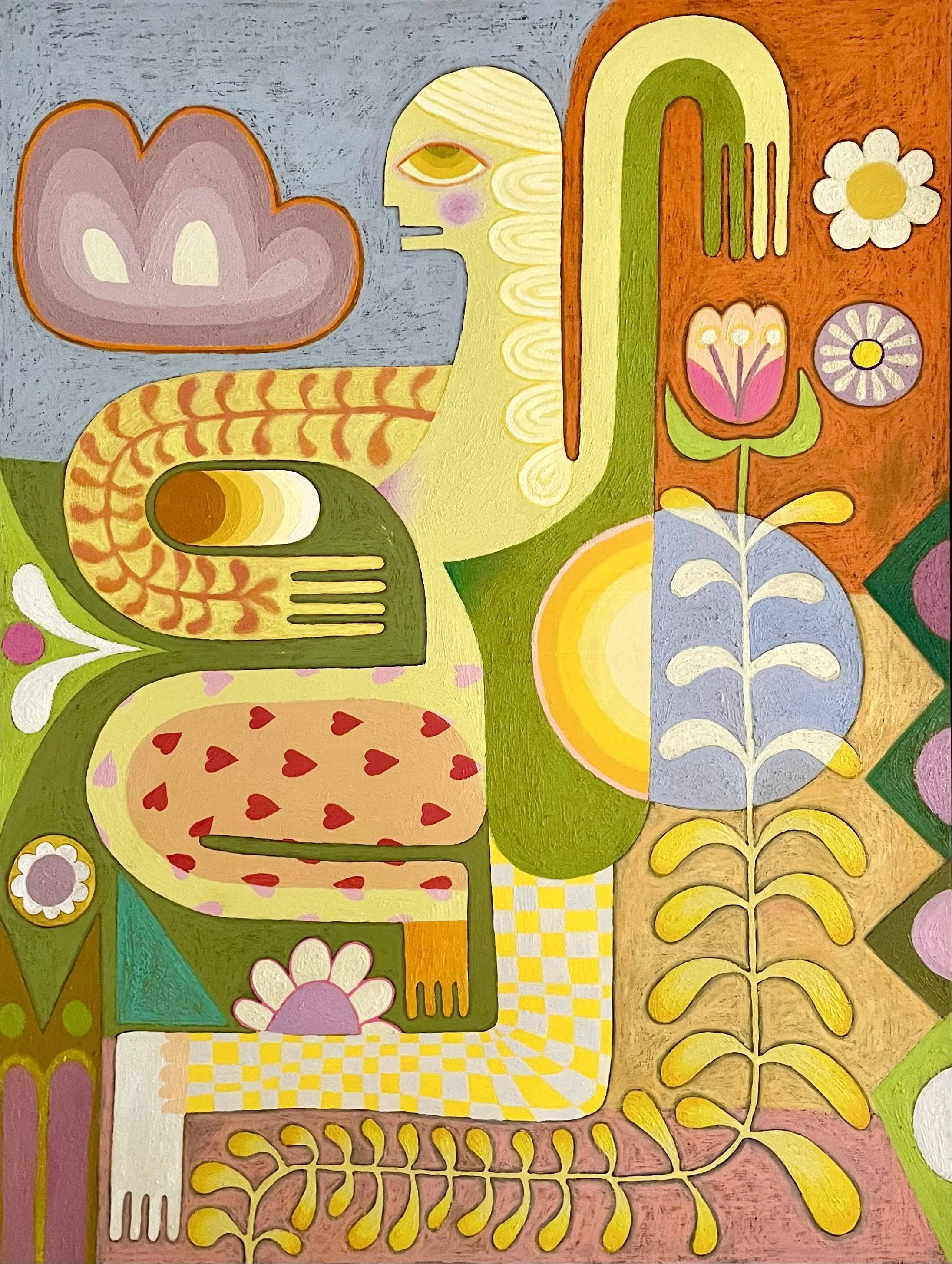 Rosenkilde's idiom combines details, geometric shapes, figures, and a unique technique that creates a granular texture, giving her works a distinctive tactile character. Her inspiration comes from dreams, folk tales, and occult stories, evoking feelings and moods that she weaves into an ornament of shapes, lines, and colors. Her works blur the boundaries between abstraction and figuration, resulting in almost subjectless pieces that emphasize the total expressiveness of the image.